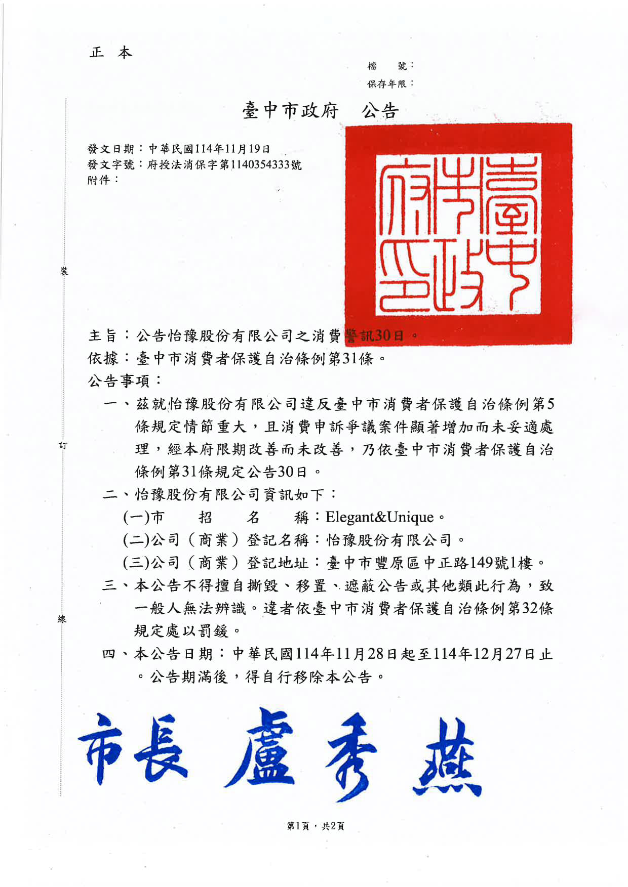 位於臺中市豐原區中正路149號之怡豫股份有限公司(店招:Elegant&Unique,下稱怡豫公司),因屢次違反消費者保護法第18條及本市消費者保護自治條例第5條規定,經衛生局裁罰仍未改善,且近來消費申訴案件數量有顯著增加的情形。臺中市政府法制局長李善植表示,臺中市於113年修正公布本市消費者保護自治條例,首創政府機關可前往業者營業場址張貼消費警訊告示之機制,在新法上路後,市府審酌怡豫公司之違規情節及消費申訴案件有顯著增加之情形,市府消保官及衛生局等於怡豫公司營業場所張貼公告,業者於114年11月28日至同年12月27日不得撕毀、移置、遮蔽或有其他類此行為致一般人無法辨識此一公告之行為,希望藉此能提醒消費者慎選店家,謹慎消費。