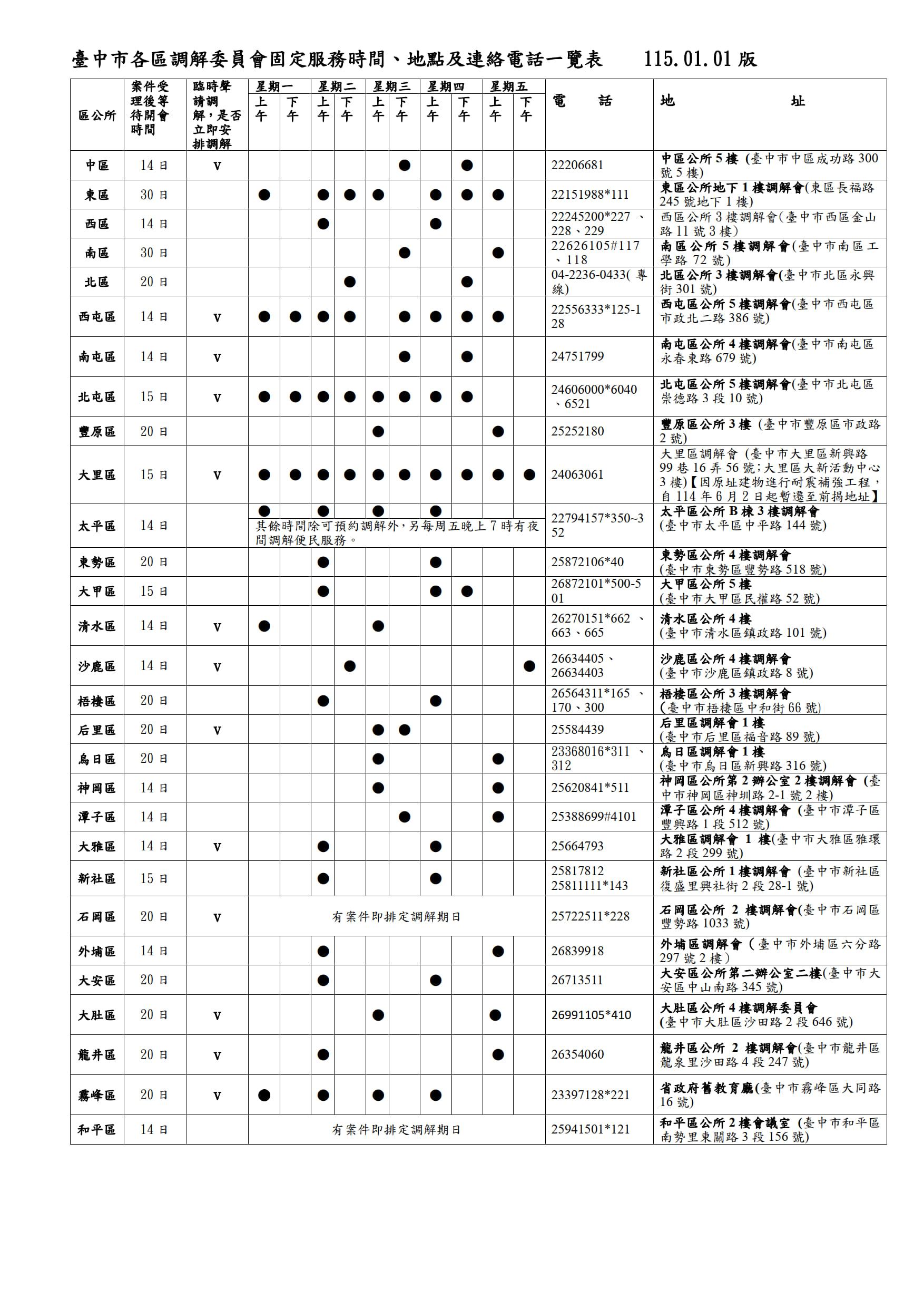 臺中市各區調解委員會固定服務時間、調解案件等候時間、地點及連絡電話一覽表 (115.01.01)